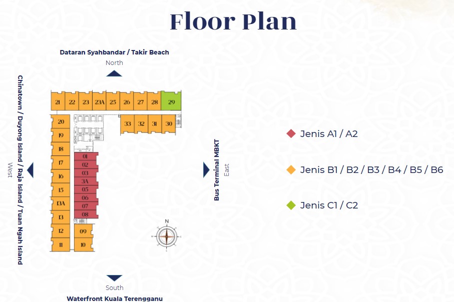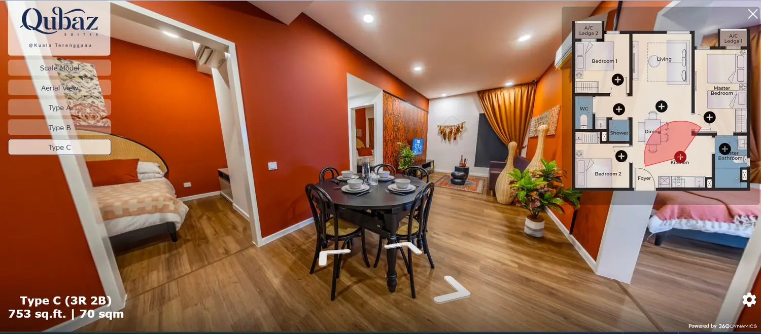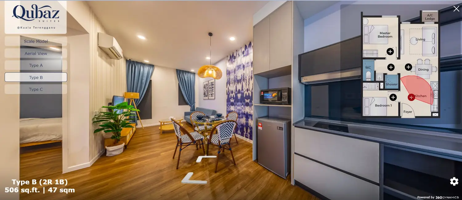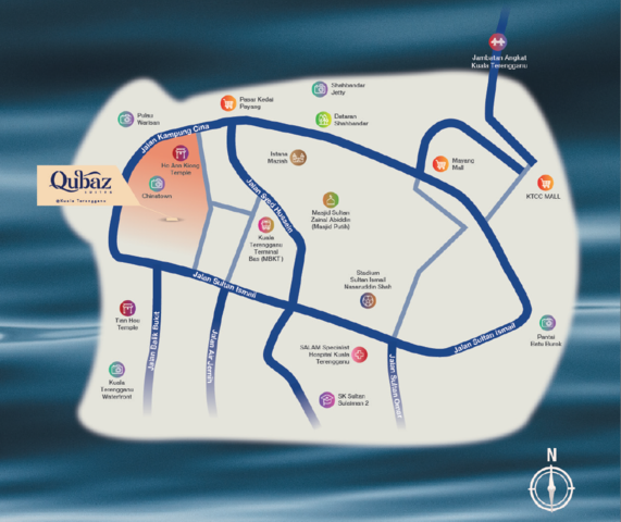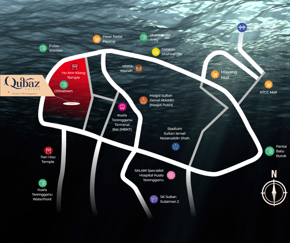Mendiami 'Qubaz Suites' merupakan kehidupan berlatarkan panorama 360 darjah kehidupan pantai. Kurang daripada 1km dari Chinatown dan kesibukan muara Sungai Terengganu di pusat bandar, dan sekadar menaiki bot untuk ke pulau. Dihubungkan dengan semua bandar Utama menerusi sistem jalan raya yang sangat baik dan hanya 15 minit dari lapangan terbang. Kejiranan ini merupakan lokasi yang paling tepat untuk mereka yang mahu ke destinasi pantai yang terkenal di dunia di pantai timur Semenanjung Malaysia.